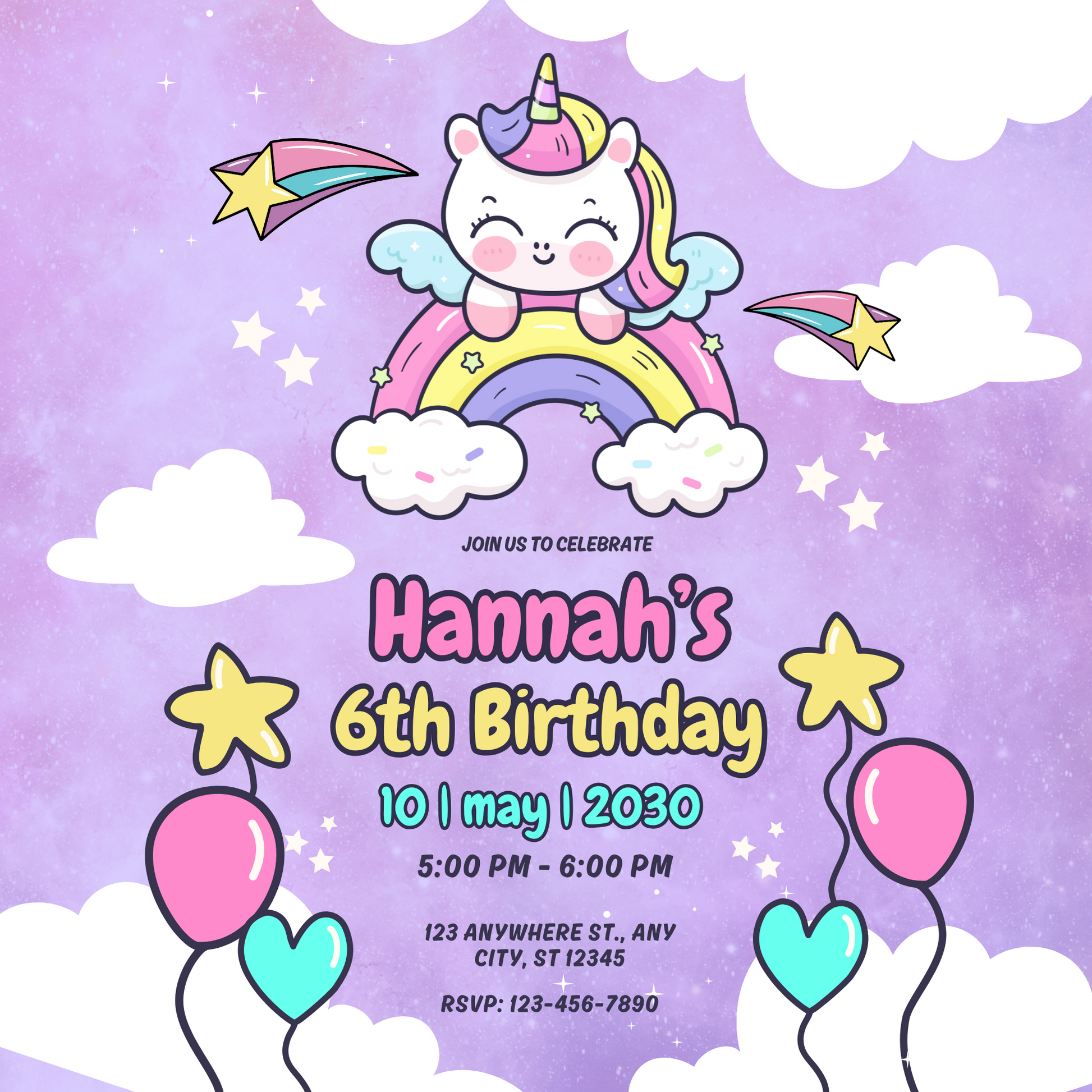 Turn your little girl’s special day into a fairytale with MAGICAL UNICORN - a whimsical purple-themed invitation featuring dreamy unicorns, sparkles, and pastel clouds. Perfect for a celebration filled with magic, giggles, and unicorn wishes come true!