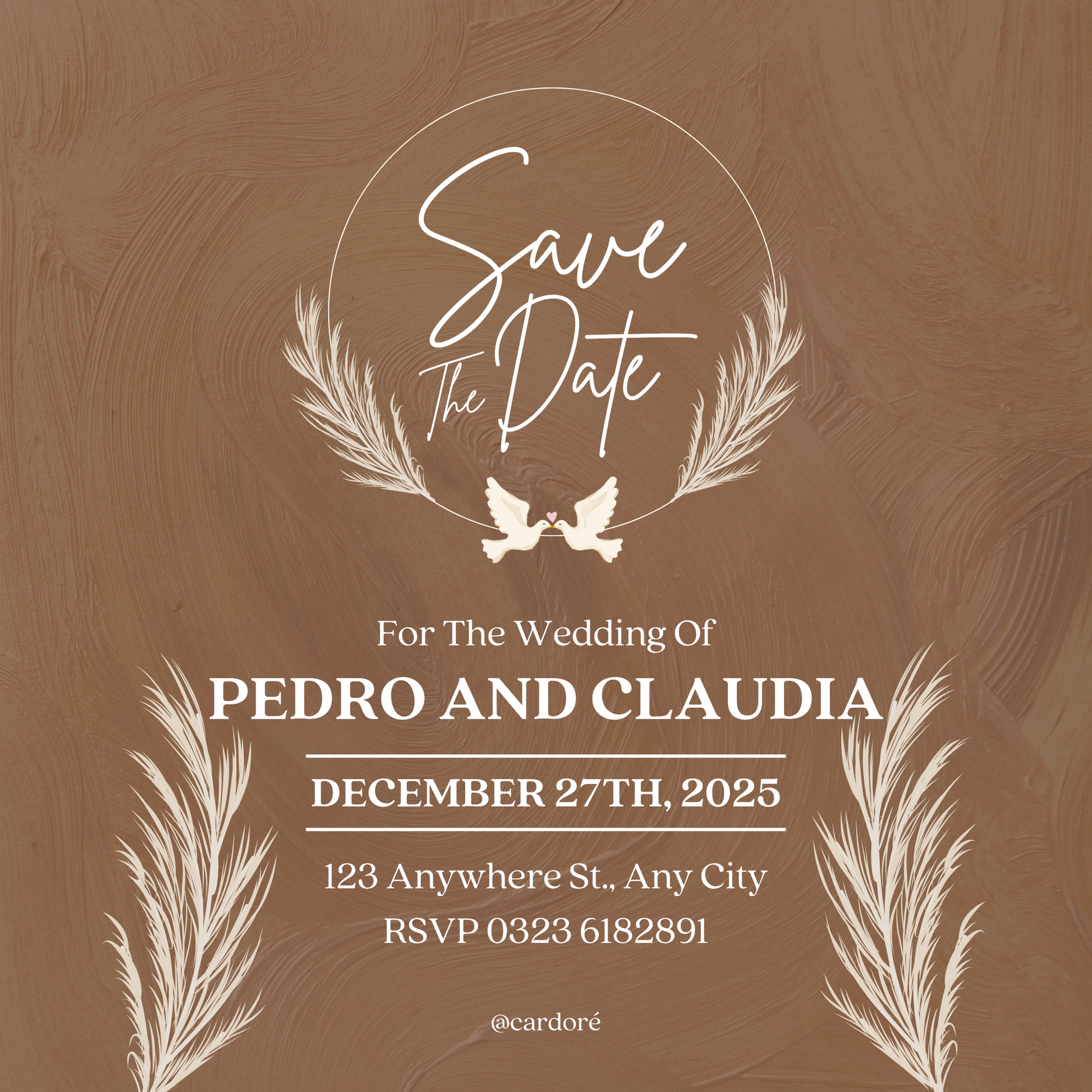 Announce your big day with elegance using our Pampas Save the Date template. Featuring soft earthy tones, romantic doves, and delicate pampas grass details, this design is perfect for boho, rustic, or nature-inspired weddings.