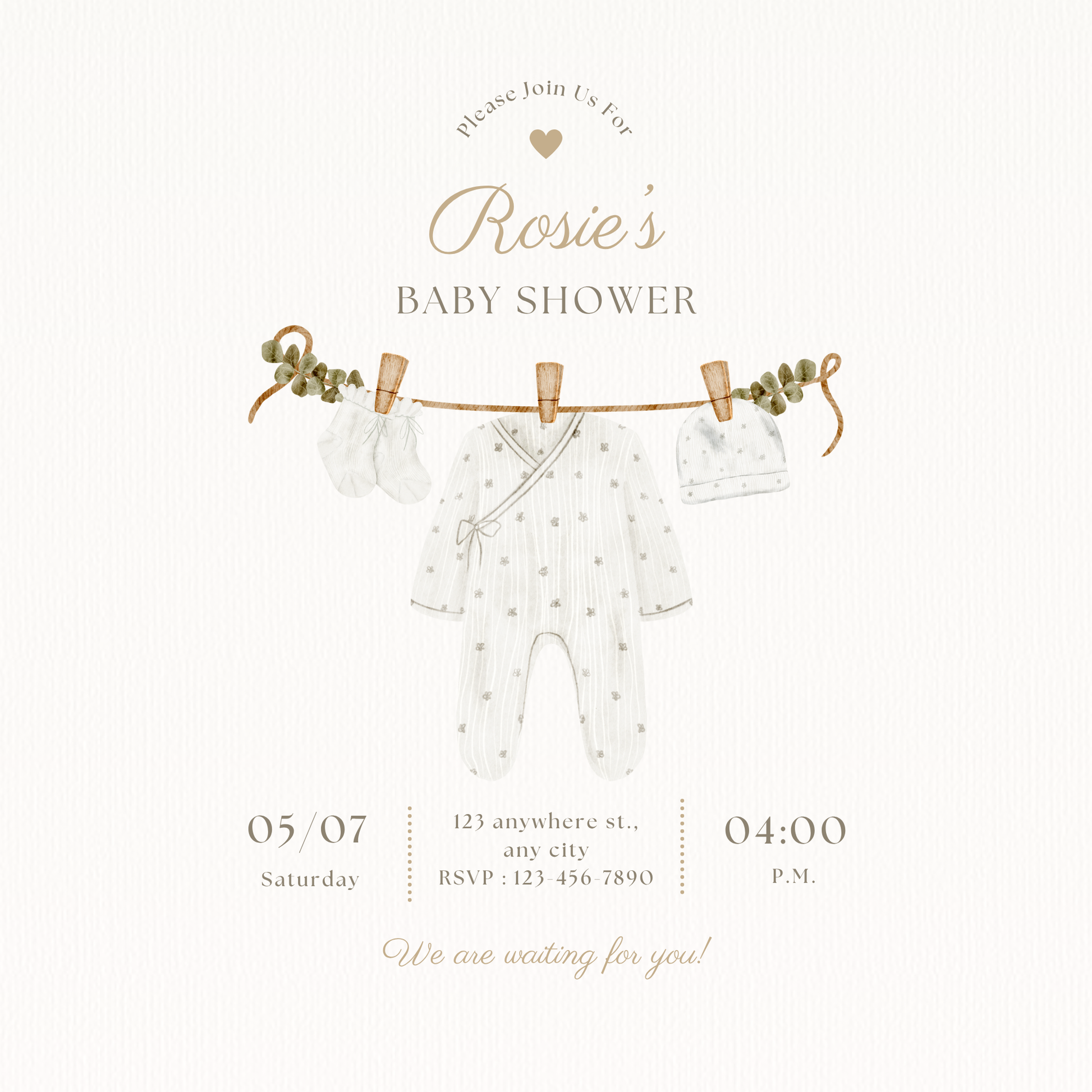 Celebrate the upcoming arrival of a little bundle of joy with our charming "Rosie's Baby Shower" digital invitation. Featuring a delicate neutral-toned design with watercolor baby essentials hanging on a rustic clothesline, this invite is perfect for a soft, elegant baby shower celebration. This beautifully designed invitation is ready to share via WhatsApp, email, or social media, making it easy to gather your loved ones for a special day.
